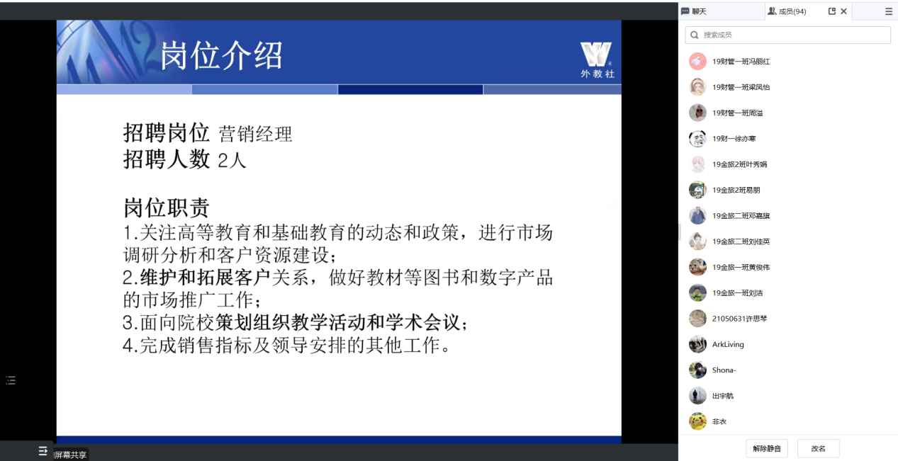为做好未落实就业去向毕业生就业推进工作,拓宽beat365官网2023届毕业生就业渠道,5月16日晚上8点,学院积极组织动员毕业生参加上海外语教育出版社江西教育发展中心线上招聘宣讲会议。学院党总支书记王颖、各毕业班辅导员和部分2023届学生参加活动。