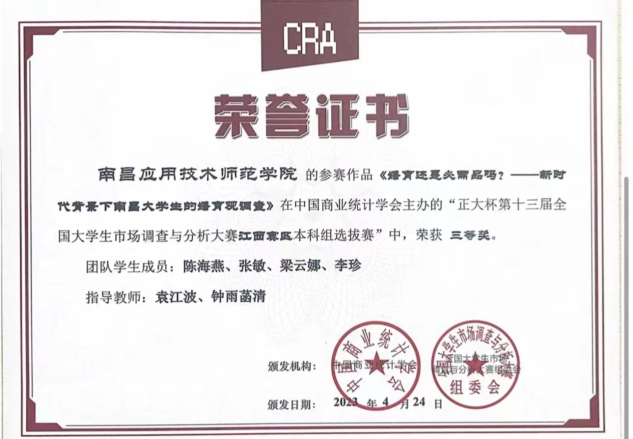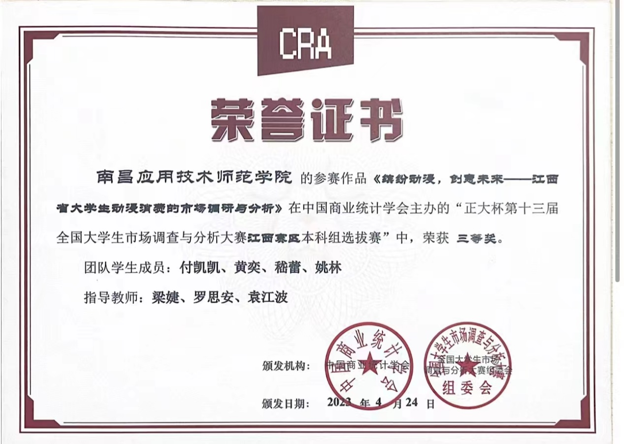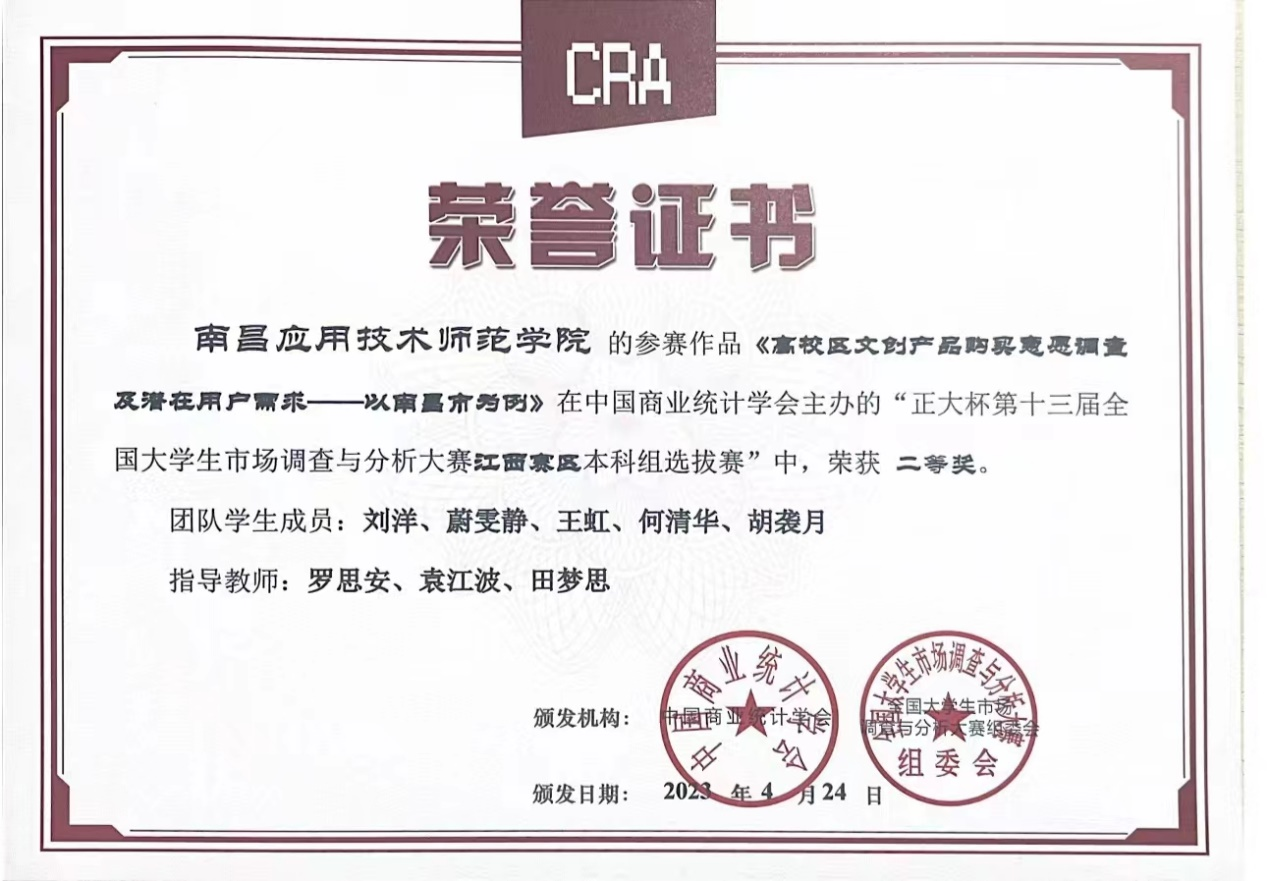 近日,由中国商业统计学会主办的“正大杯第十三届全国大学生市场调查与分析大赛”,江西赛区本科组已公布比赛结果,beat365官网beat365英国官方网站罗思安、袁江波、田梦思、梁婕和钟雨菡清老师指导的学生参赛作品获得比赛二等奖1项,三等奖3项。