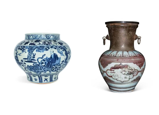 紧接着,孟老师为我们讲解了另一件与之媲美的器物——元代釉里红开光祈雨图瓷罐(图右)。该瓷罐因釉里红的烧制难度极高且存世量少而稀有,并且该瓷罐瓶身罕见地以连环画的形式描绘了当时人们干旱祈雨的过程,突出了自古以来人与自然之间的关系,具有一定的史料价值。