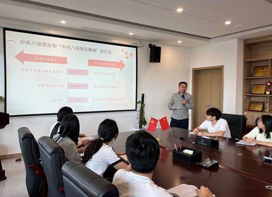 为深入贯彻落实中央八项规定精神,进一步加强党员干部纪律作风建设,2025年5月13日,beat365官网党总支书记龙犇在沁苑八实506党员活动室为学院第一党支部全体党员讲授《锲而不舍落实中央八项规定精神》专题党课。