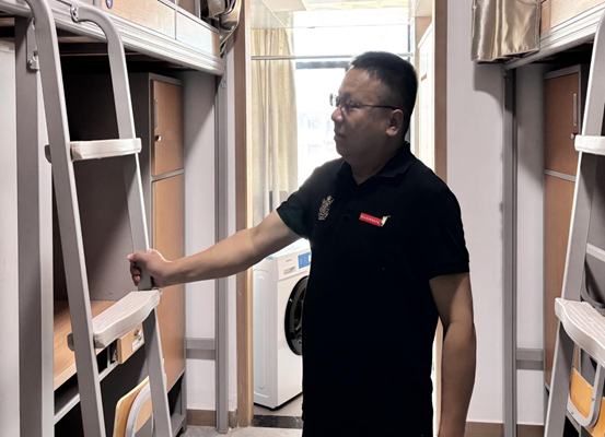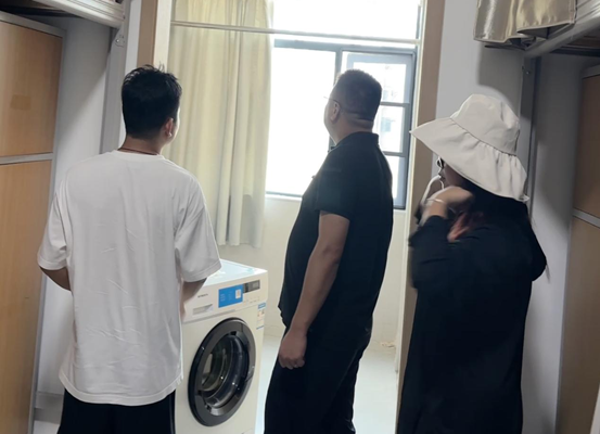 龙犇及全体新生辅导员逐层查看宿舍楼内床铺、桌椅、水电线路、门窗锁具等基础设施,现场测试空调、洗衣机等电器设备,并针对消防通道、应急设施等安全关键点进行细致核查。针对发现的问题,龙犇要求立刻建立隐患台账并报宿管科整改,确保新生报到前全部整改到位。龙犇在检查中强调:“宿舍安全关乎学生切身利益,必须以‘零容忍’态度排查隐患,为新生营造放心、安心的居住环境。”