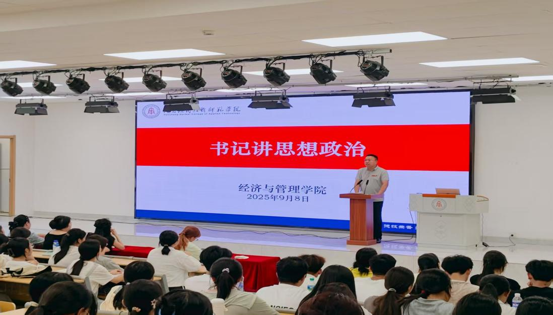 随后,龙犇带来思想政治教育讲座。他结合新时代的背景,阐述了思想政治教育对于大学生成长成才的重要性。他引用鲁迅的《彷徨》《呐喊》《伤逝》《朝花夕拾》,形象地描绘出大学四年不同阶段的心理变化与成长轨迹,让新生们对大学生活有了更清晰的认知。同时,龙犇还向新生们提出三点建议:一是要志存高远,将个人理想与国家需求紧密融合;二是要以“空杯心态”重新出发,适应大学学习与角色转变;三是要全面发展,提升专业能力的同时注重人格修养与兴趣培养,在实践中涵养家国情怀与社会责任。他的话语饱含着对新生们的殷切期望,为他们的大学征程指明了方向。
