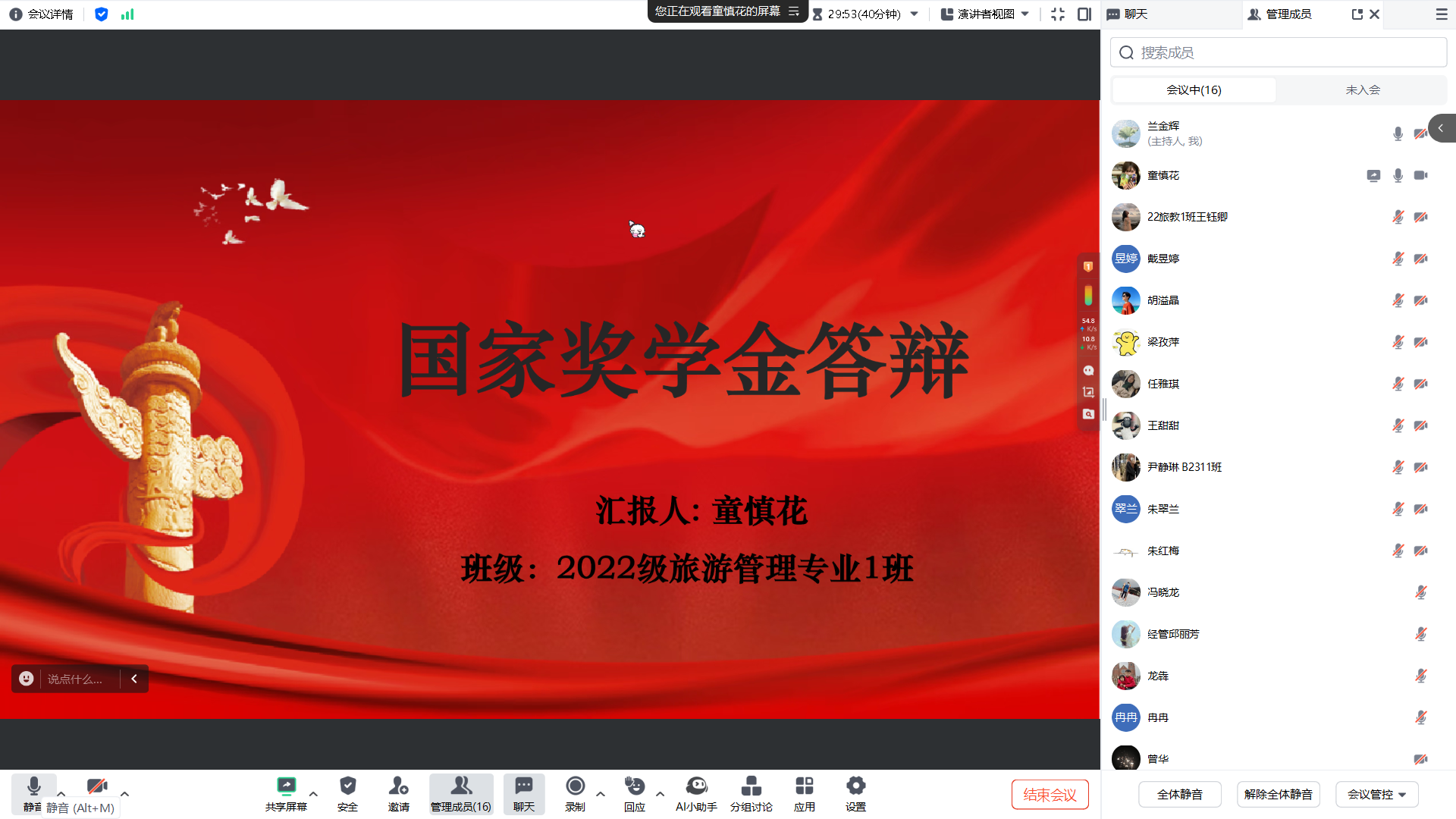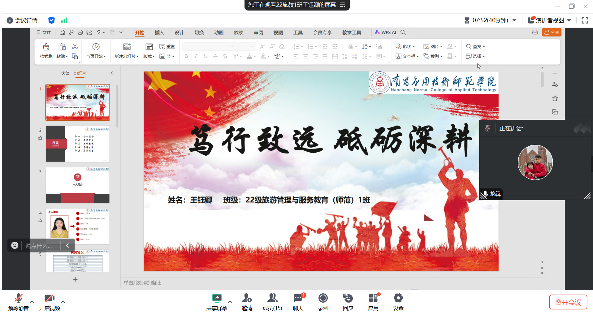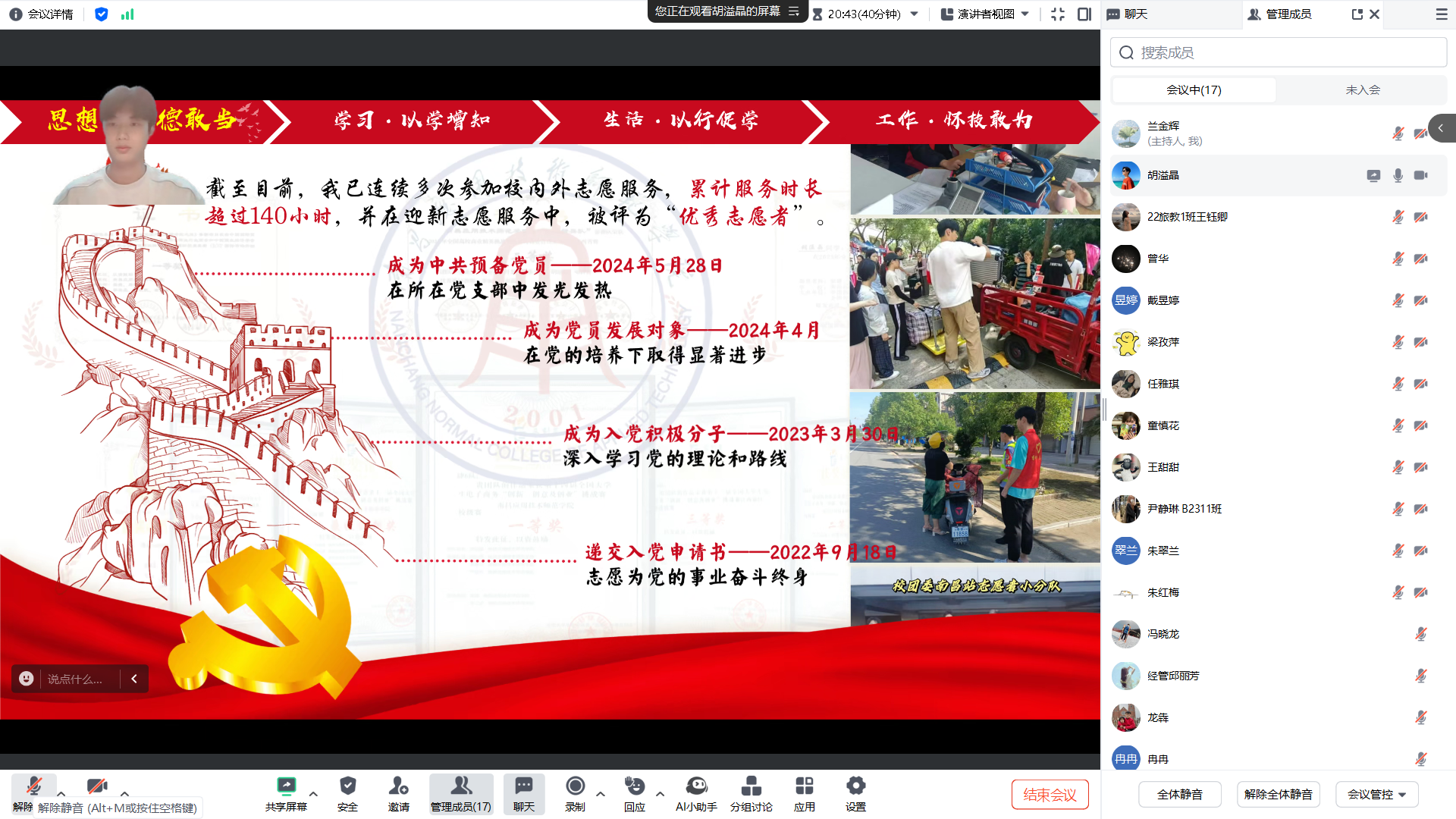 答辩会上,8 位候选学子依次展示。他们结合 PPT,从思想觉悟、学业成绩、科研实践、学科竞赛、志愿服务及未来规划等方面,全面阐述个人成长经历与突出成果:有的学子凭借优异的专业成绩稳居年级前列,用扎实的学识展现学霸风采;有的学子深耕科研领域,在学术论文撰写、科研项目参与中积累丰富经验;有的学子积极投身社会实践与志愿服务,以实际行动践行青年担当。