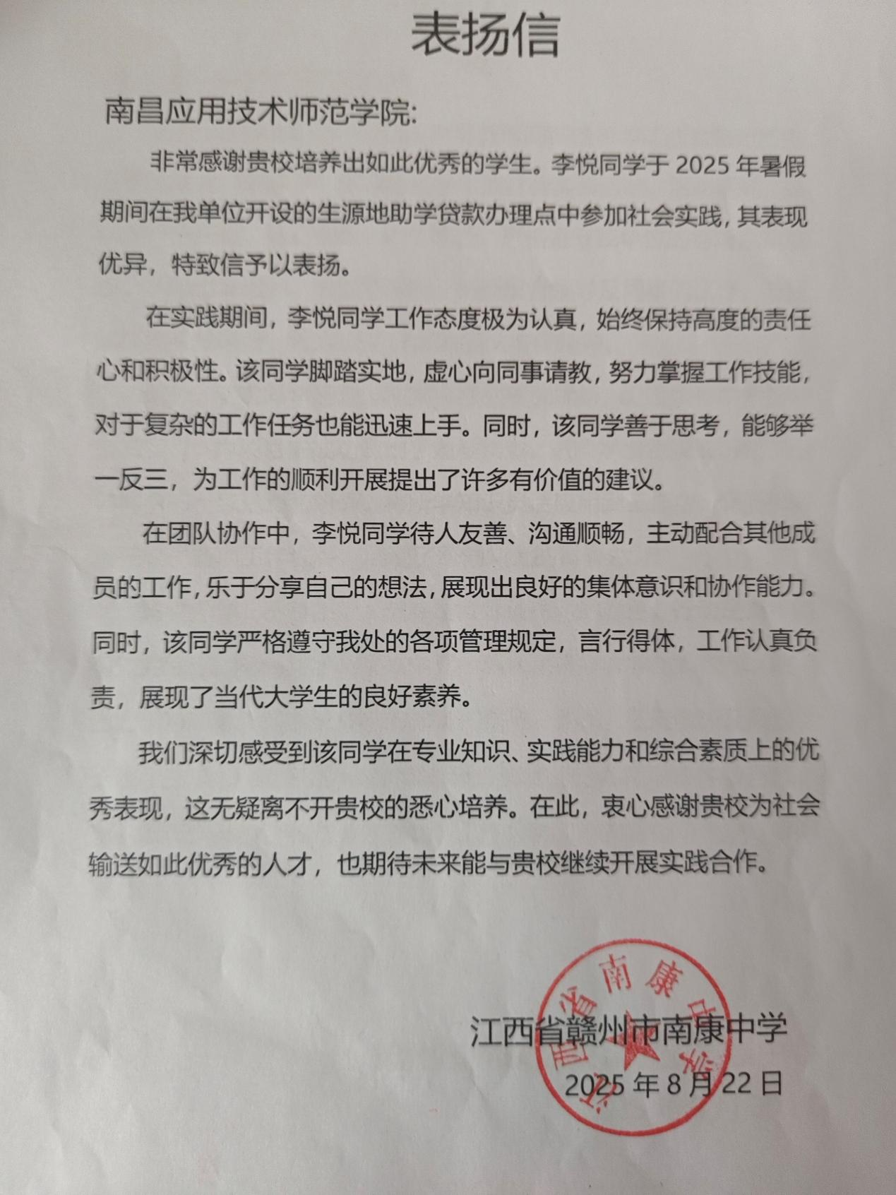 脚踏实地的付出,终获官方高度认可。赣州市南康区教育事业发展中心为她颁发“优秀志愿者”荣誉证书,南康中学、南康区教育事业发展中心也先后发来表扬信,称赞她工作认真负责、协作能力突出、专业素养过硬,生动展现了当代大学生的良好风貌。