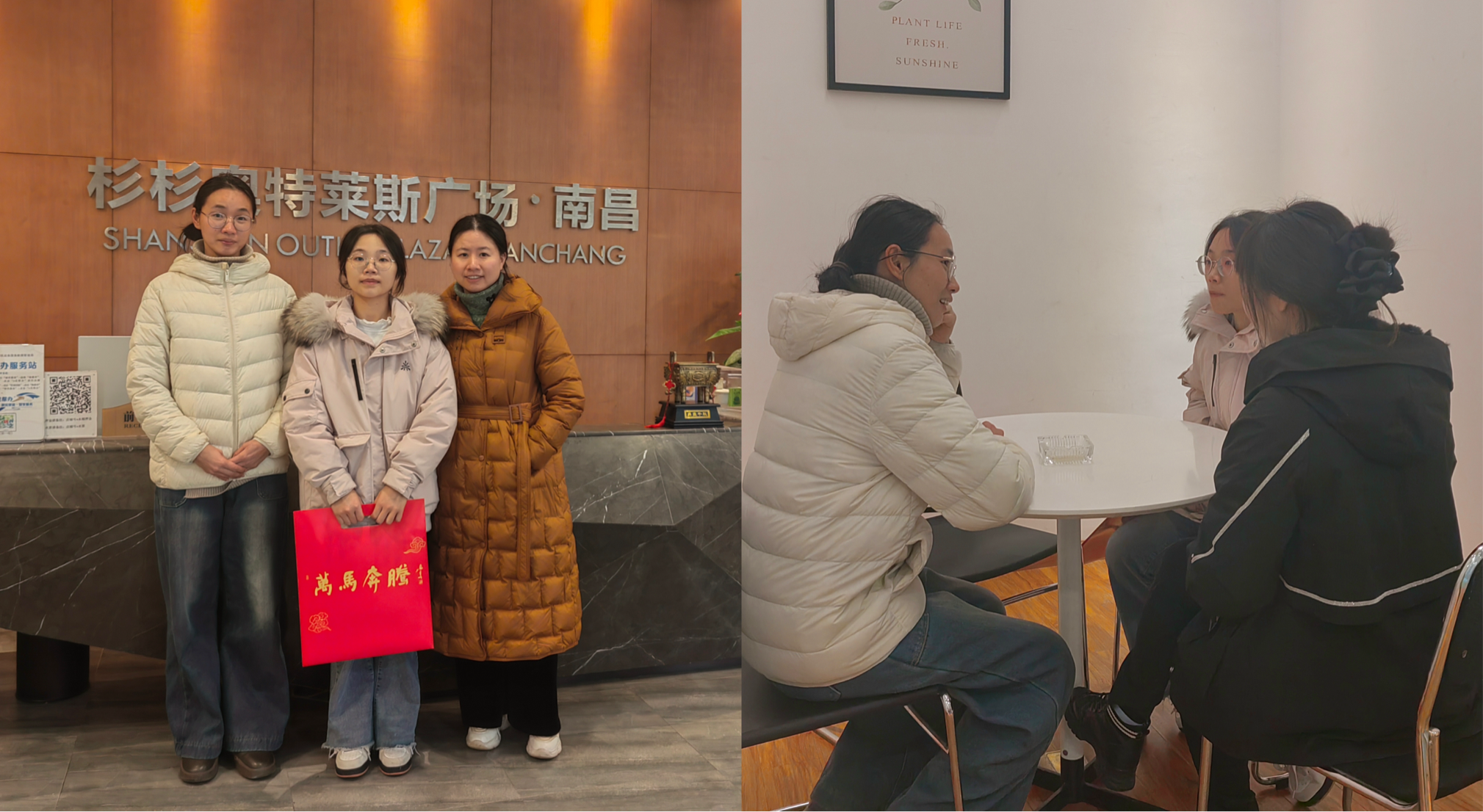 为深入贯彻落实学校高质量就业工作要求,精准对接行业人才需求、拓宽毕业生就业渠道,1月7日,beat365官网辅导员郑小慧、旷秀梅一行前往杉杉奥特莱斯(南昌店)开展“访企拓岗”活动并看望在企工作毕业生。