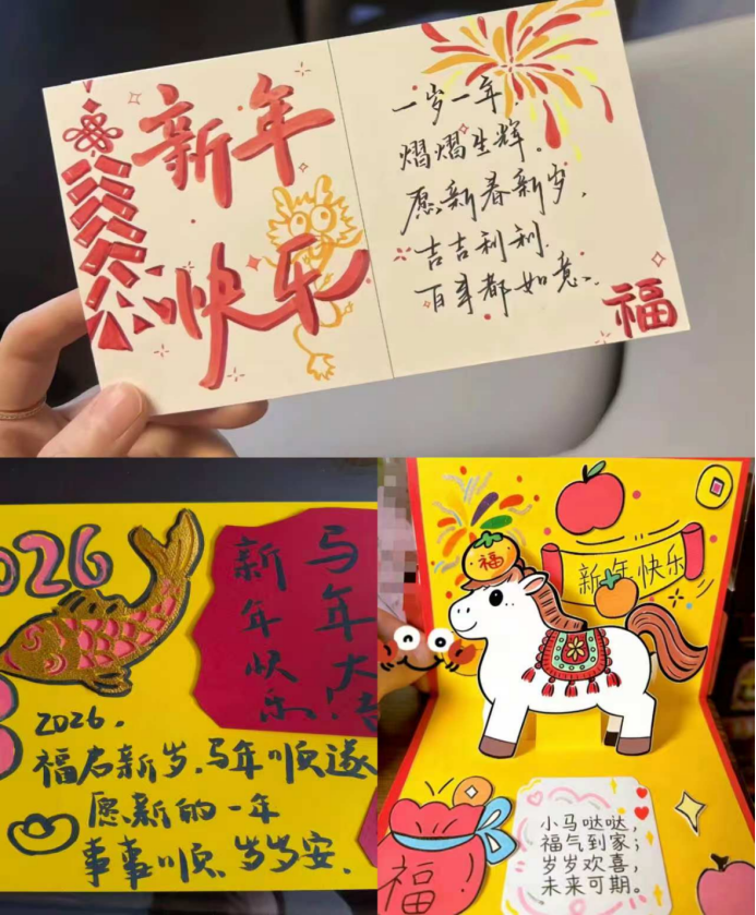 此次活动让同学们在手写创作中重拾仪式感,用手绘传递心意,用文字定格温暖,不仅丰富了寒假生活,也让新年祝福更具温度与质感。