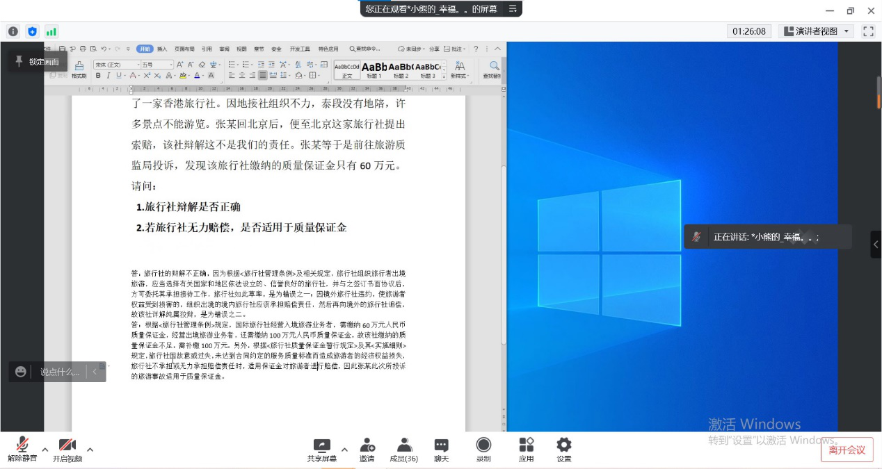 2022年3月16号上午,beat365英国官方网站的熊桃慧老师给我们带来了一堂轻松愉快的线上旅游法规课程。在上课开始前,熊老师积极备课并提前熟悉线上教学软件;在上课期间,她目标明确地带我们回顾了上节课的内容;逻辑清晰地将课程中的理论知识与实际经验相结合。同时在课程中提出问题,以增加课堂的互动性。我们也紧跟老师的思维,积极回答老师的提问。在疫情期间,虽然我们无法面对面的交流和锻炼,但老师仍心系学生,多次嘱咐我们要加强锻炼和注意身体健康。